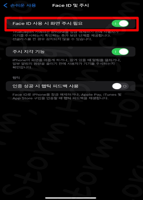 4. Face ID 에 주의 필요라는 옵션을 비활성화합니다. ( 장치 PIN 코드를 입력해야 하므로 요청 시 입력하십니다. )