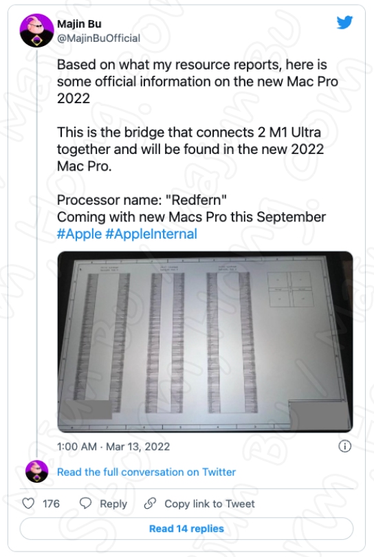 Majin Bu 는 Twitter 를 통해 두 개의 M1 Ultra 칩셋을 연결하여 단일 맞춤형 Apple Silicon 이 나올 수 있다는 이야기를 전했습니다. 이는 아직까지 예상, 예측, 루머, 소문의 이야기이며, Apple 에서 공개되지 않은 내용입니다. 이에 대한 이름이 무엇인지 어떤 사양을 보일 것인지에 대한 내용은 나오지 않았습니다.
