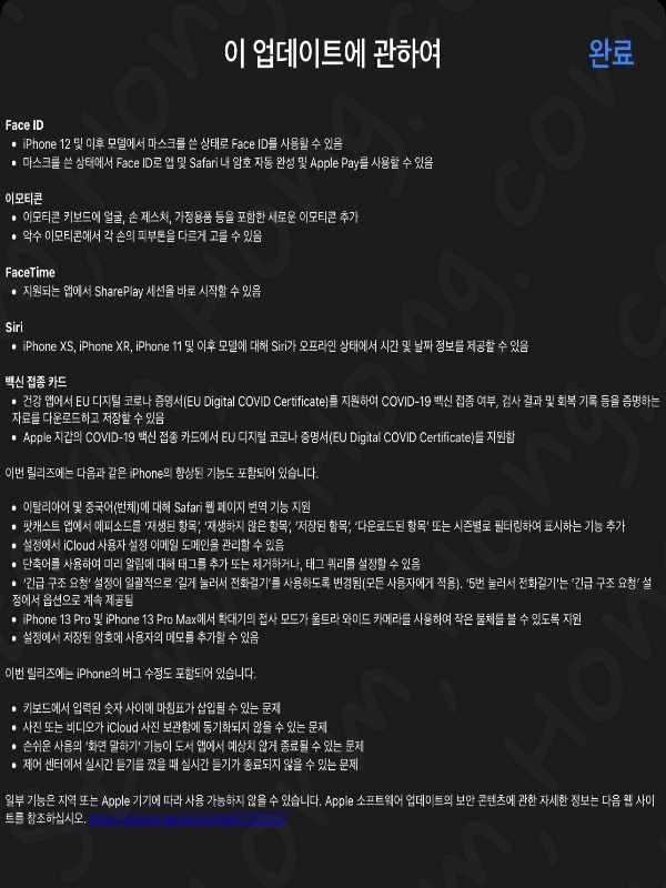 * Face ID , * Face Time , * 백신 접종 카드, * 성능 향상 업데이트 , * iPhone 의 버그 수정 포함되어 있습니다. 자세한 내용은 사진을 참조해 주시기 바랍니다.