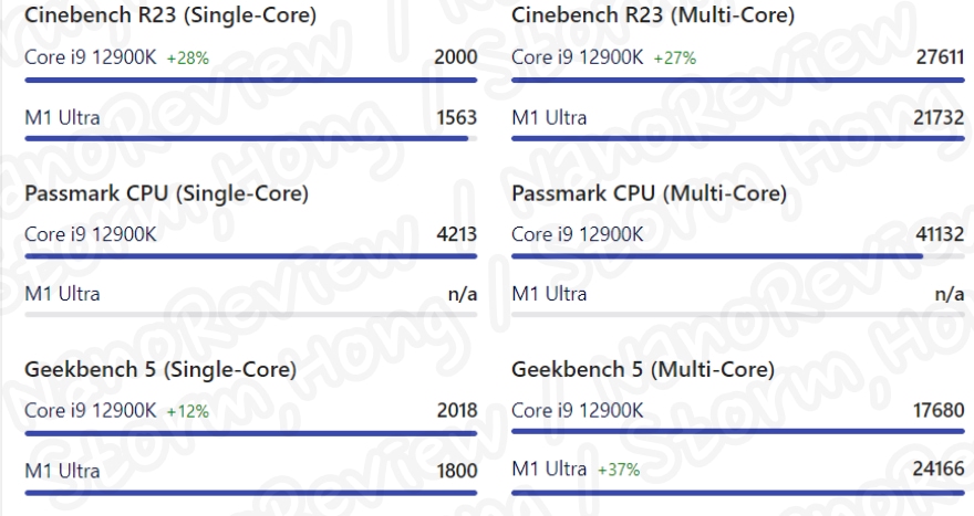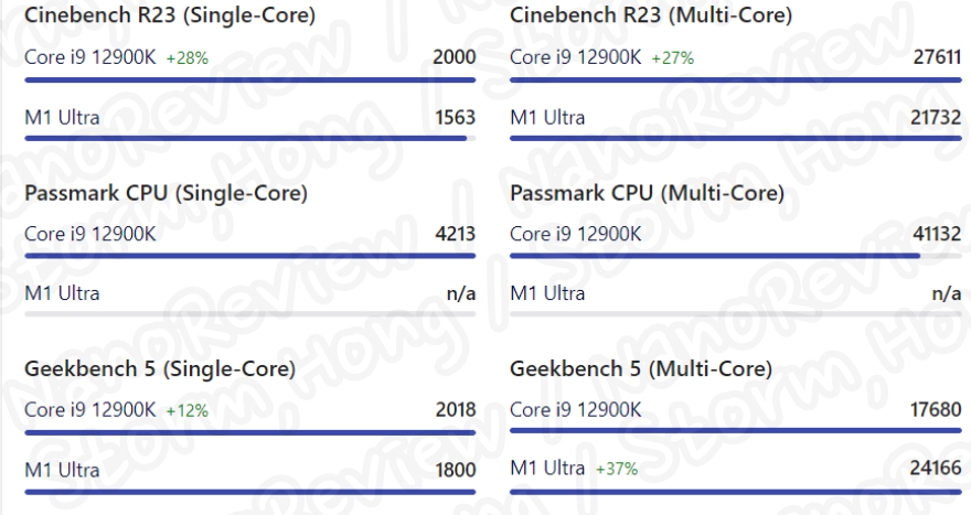 Apple 은 새로운 칩 12900K 보다 동일한 전력과 더 높은 성능에서 90% 더 나은 성능을 제공하면서 100W 더 낮은 전력을 소비ㅣ한다고 알려졌습니다. 아래 벤치마크에는 이러한 성능에 대한 내용들이 표시되지 않았습니다.