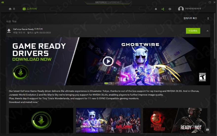 최신 NVIDIA GeForce Driver 512.15 는 2022년 3월 22일 (EST) 업데이트를 진행했으며, Nvidia GeForce Driver 는 Tango Gameworks 에서 개발한 액션/어드벤처 게임인 Ghostwire : Tokyo 에 대한 최적화를 제공하는 업데이트입니다.