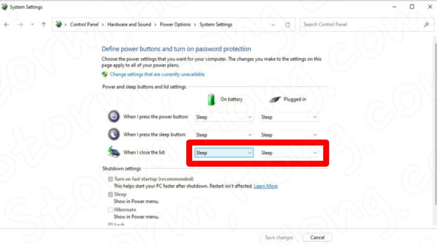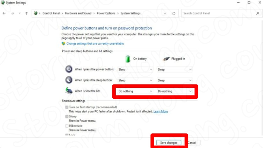 6. 덮개를 닫을 때 옆에 있는 드롭다운 메뉴 에서 아무 작업도 하지 않음 을 선택 합니다.
