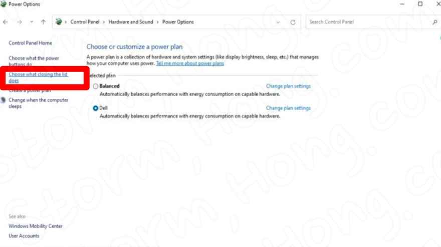 5. 왼쪽 창 에서 덮개를 닫으면 수행되는 작업 선택을 선택합니다 .