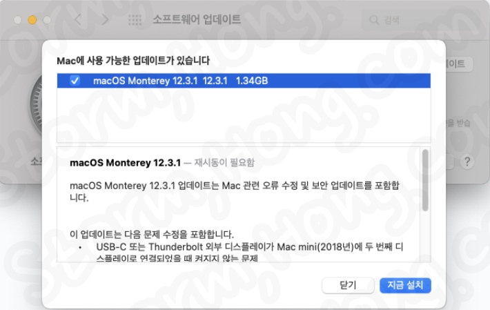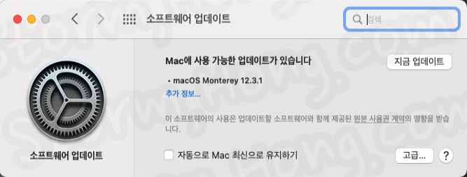 * macOS Monterey 12.3.1 업데이트 설치 공간은 1.34 GB 입니다. (설치용량은 이전 버전의 업데이트를 하지 않으신 분은 더 큰 용량일 수 있습니다.)