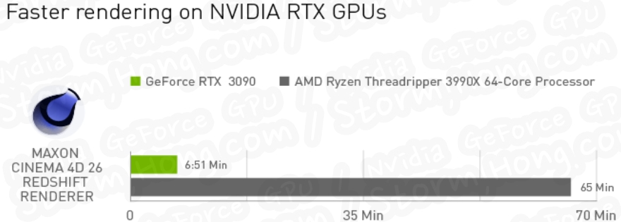 드라이버 업데이트를 통해 향상된 성능을 보여주기 위해 NVIDIA는 GeForce RTX 3090 그래픽 카드를 기본 Zen 2 아키텍처를 기반으로 하는 64 코어 프로세서인 AMD Ryzen Threadripper 3990X와 비교했습니다. NVIDIA에 따르면, 새로운 Cinema 4D 버전의 RTX와 MaxON의 Canon이 포함되어 있다고 합니다. 또한 지포스 RTX 3090은 도시 장면을 만드는 데 약 7분밖에 걸리지 않았고, 라이젠 스레드리퍼는 1시간(정확히 65분) 이상 걸렸다.