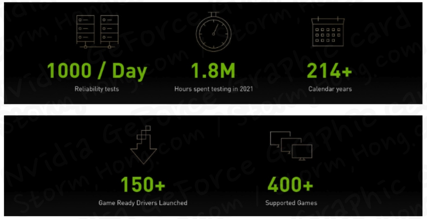 Game Ready 드라이버 테스트 프로세스에는 다양한 출시 및 출시 예정 타이틀에 대한 1,000개 이상의 다양한 테스트가 포함된다고 아려졌습니다. 이는 2021년에만 180만 시간 이상의 테스트에 해당합니다. 이 모든 것은 플레이어가 Day 0 부터 최고의 게임 경험을 할 수 있도록 하기 위한 것이라고 알랴졌습니다. Game Ready 상태는 수백 명의 전문 엔지니어, 수천 대의 테스트 PC, 우수성에 대한 집중, 광범위한 투자 및 개발자와의 긴밀한 협력을 통해 만들어진다고 합니다.