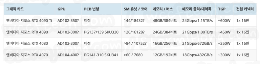 NVIDIA GeForce RTX 4090 그래픽 카드는 384 비트 버스 인터페이스에서 21 Gbps로 24GB의 GDDR6X 메모리를 추가로 작동하고 1.0TB/s 이상의 대역폭을 제공할 것으로 보입니다. 알려지고 있는 예상, 예측, 루머, 소문의 정보에서는 전체 TDP 수치를 450W로 낮추어 NVIDIA GeForce RTX 4090 이 600W 의 완전 지방 변형이 함께 갈 것으로 예상, 예측, 루머, 소문으로 알려지고 있는 클럭에 미쳐지지 않을 수도 있다는 이야기도 나오고 있습니다.