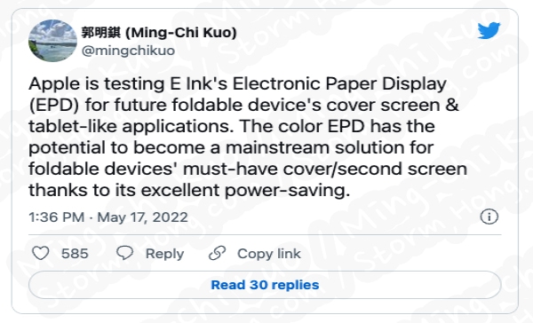 그러나 현재는 Apple의 첫 폴더블 iPhone 또는 폴더블 iPad 출시에 관한 한 긍정적인 소식은 알려지지 않았습니다. 또한 Ming-Chi Kuo 는 자신의 트윗에서 업데이트를 제공하지 않았습니다. 20인치 폴더블 MacBook 이 몇 년 안에 출시될 수 있다는 이야기도 있지만 보조 디스플레이가 없을 것이라는 이야기가 나오고 있으며, 이는 때문에 전자 잉크 기술을 사용하지 않을 가능성이 높다고 알려졌습니다. Apple의 다른 폴더블 기기의 메인 디스플레이는 편광층이 없는 OLED 패널을 사용할 수 있다는 예상, 예측, 루머, 소문의 정보도 나왔습니다.