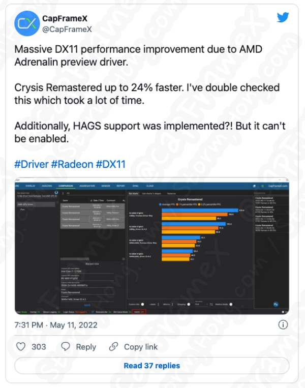 평균적으로 AMD는 DirectX 11 게임으로 약 10% 향상을 기대할 수 있으며 위에 나열된 타이틀은 실제로 빙산의 일각에 불과하다고 말합니다. 예를 들어 독립 테스터는 Crysis Remastered 및 God of War와 같은 게임에서 상당한 향상을 이루었습니다.