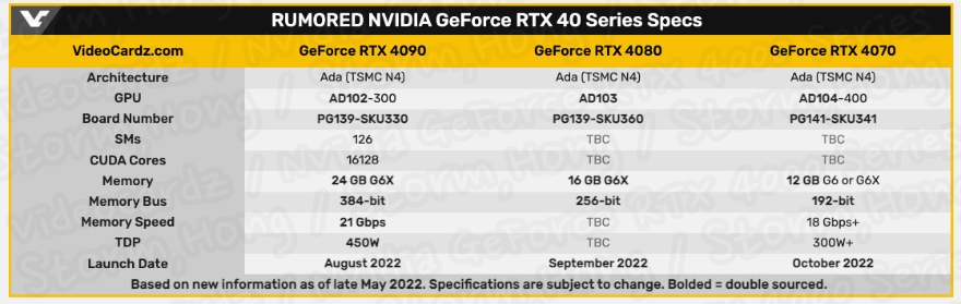 NVIDIA GeForce RTX 4000 Series 인 NVIDIA GeForce RTX 4090, NVIDIA GeForce RTX 4080, NVIDIA GeForce RTX 4070 그래픽 카드에 대한 정보는 Videocardz 의 정보에 의해 나타났으며 2022년 3분기 및 4분기에 출시될 것으로 예상된다고 알려졌습니다. 이에 대한 자세한 내용은 다음과 같습니다.