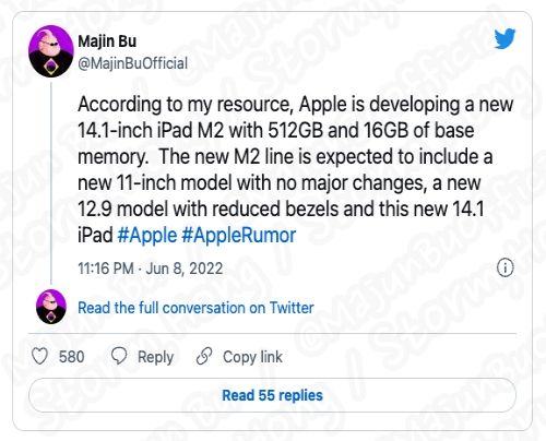 또한 트윗을 통해 Majin Bu Apple 의 새로운 14.1 인치 아이패드 프로를 개발 중이라는 이야기를 이야기를 전하면서 iPad Pro 모델은 기본 형이 512 GB 스토리지 및 16 GB 메모리와 결합된 Apple 의 최신 M2 칩을 탑재할 것이라고 예상, 예측, 루머, 소문의 정보를 전했습니다.