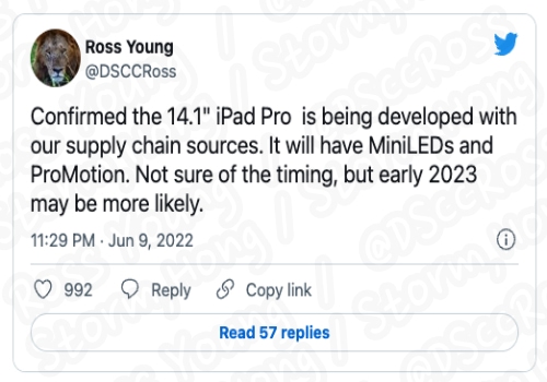 디스플레이 분석가인 Ross Young 은 트윗을 통해 새로운 M2 칩이 탑재된 14.1 인치 iPad Pro 에 대한 예상, 예측, 루머, 소문의 정보를 전했습니다. 이 새로운 iPad Pro 에는 Mini LED 디스플레이와 함께 ProMotion 기능도 함께 제공할 것이라는 예상, 예측, 루머, 소문의 정보였습니다. 이는 현시점에서 가장 큰 iPad Pro 의 디스플레이 크기는 12.9 인치이며, 알려지고 있는 제품은 보다 큰 14.1 인치가 될 것으로 보입니다.