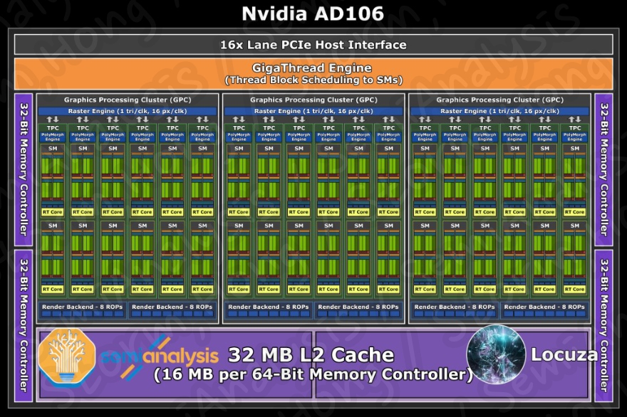 NVIDIA AD106 'Ada Lovelace' 게임용 GPU 블록 다이어그램 목업(이미지 제공: SemiAnalysis ):