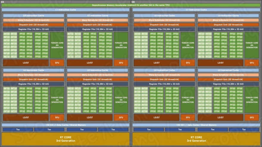 따라서 전체적으로 각 하위 코어는 32개의 FP32와 16개의 INT32 장치로 구성되어 총 48개의 장치가 됩니다. 각 SM에는 총 128개의 FP32 장치와 64개의 INT32 장치가 포함되어 총 192개의 장치가 있다고 알려졌습니다. 총 36개의 SM 장치 (GPC당 12개) 가 있으므로 총 6,912개의 코어에 대해 4,608개의 FP32 장치와 2,304개의 INT32 장치를 볼 수 있을 것으로 알려졌습니다. 또한 각 SM에는 SM당 64 개 랩에 대한 2 개의 랩 일정 (32 스레드/CLK)도 포함될 것으로 보인다고 합니다. 이는 GA102 GPU에 비해 코어(FP32+INT32)가 50% 증가하고 랩/스레드가 33% 증가할 것으로 예상, 예측, 루머, 소문으로 정보가 알려졌습니다.