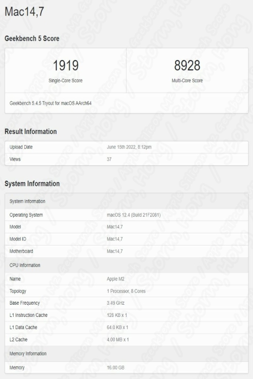 Apple Silicon M2 에 대한 Geekbench 의 정보가 나타났습니다. M2 칩의 단일 코어 점수는 1919 , 다중 코어 점수는 8928 점수를 기록한 것으로 알려졌습니다. 테스트에 사용된 장치는 16GB 통합 LPDDR5 RAM 으로 테스트가 되었습니다. 기본 주파수는 3.49 GHz 에서 작동한 것으로 가정되었다고 합니다. 단일 코어 테스트에서 M2 는 M1 보다 12% 더 높은 점수를 얻었으며, 멀티 코어 결과는 19% 개선된 것으로 알려졌습니다.