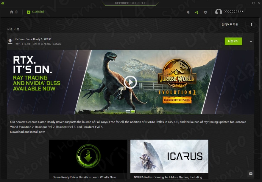 최신 NVIDIA GeForce Driver 516.40 Driver 는 2022년 6월 15일 (EST) 업데이트에서는 Resident Evil 2 Remake, Resident Evil 3 Remake, Resident Evil 7 live ray tracing 업데이트를 진행할 준비를 할 것으로 보이며, Fall Guys Free For All 과 iCARUS 에 대한 Reflex 지원을 제공할 것으로 보인다고 합니다.