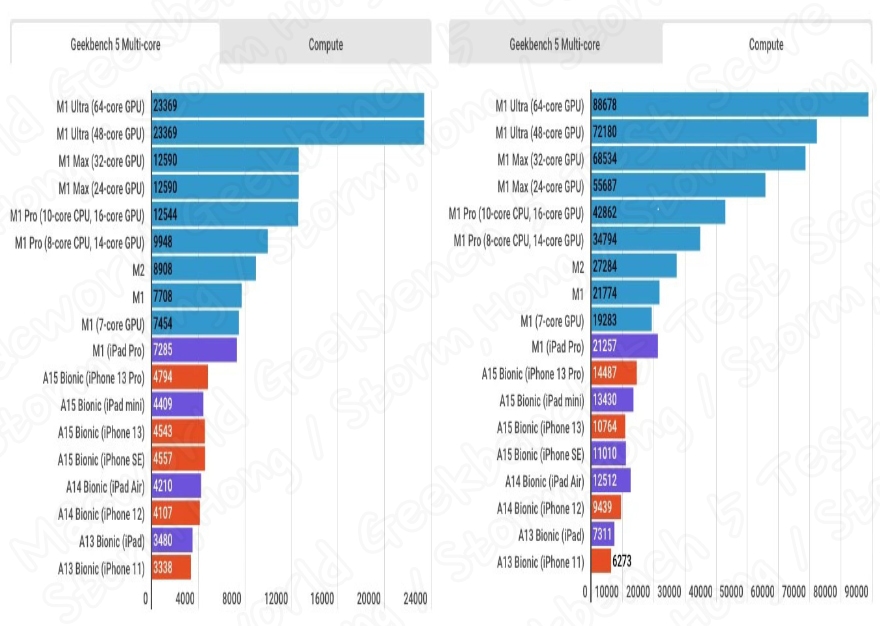 ↑ A13 Bionic 부터 M1 Ultra Apple Silicon 까지 Geekbench 비교 점수