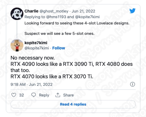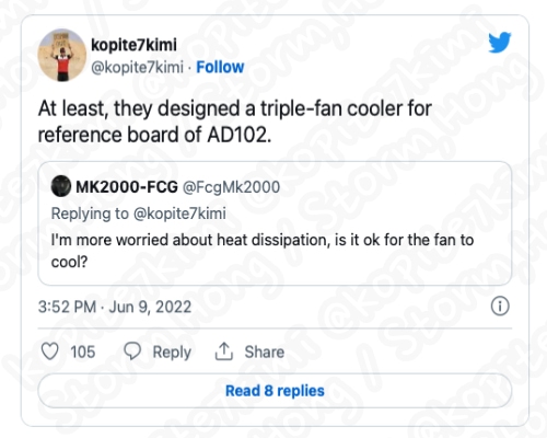 세부 사항은 NVIDIA의 GeForce RTX 4090 Ti 및 NVIDIA GeForce RTX 4090 에 대한 TGP 등급이 450~600W 이라는 높은 전력 소모가 될 것이라는 정보가 나타났습니다. 이전 Kopite7kimi 에 의해 알려진 예상, 예측, 정보에 따르면 NVIDIA GeForce RTX 4000 Series 는 기존 NVIDIA GeForce RTX 3000 시리즈에서 사용되는 유사한 쿨러를 사용할 것으로 보인다는 의견과 함께, 내부 변경 사항 변경에 대한 예상, 예측, 루머, 소문의 정보가 있었습니다. NVIDIA GeForce RTX 4090 Ti 및 NVIDIA GeForce RTX 4090 용 Founders Editiion 쿨러는 PCI 3개 슬롯 또는 3.5개 슬롯 사이에 있을 것으로 보인다는 정보와 함께, 더 많은 핀과 더 많은 방열판 표면적을 제공할 것으로 보인다는 예상, 예측, 정보가 나타났습니다.