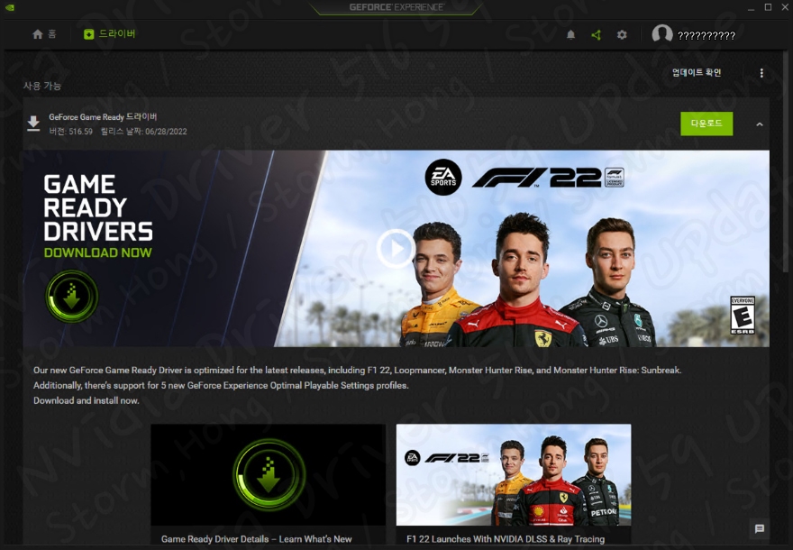 최신 NVIDIA GeForce Driver 516.59 Driver 는 2022년 6월 28일 (EST) 업데이트에서는 Ea Sports F1 22 및 기술을 위한 업데이트 및 Loopmancer 및 Monster Hunter Rise: Sunbreak 를 비롯한 새로운 게임 출시에 최적화되어 있습니다. 를 위한 업데이트가 이루어 졌습니다. 이 업데이트를 통해 5개의 새로운 NVIDIA GeForce Experience Optimal Playable Settings 프로필과 새로롭게 출시 되는 Nvidia GeForce GTX 1630 도 지원 하는 것으로 알려졌습니다.