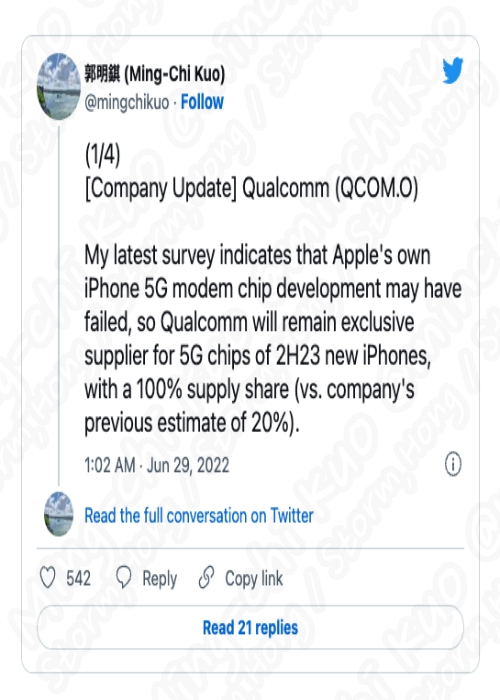 이에 Ming-Chi Kuo 의 최근 개발 상황을 고려한다면 이는 새로운 계약이 만료될 때까지 Qualcomm 과 새로운 계약을 체결할 가능성이 높아 보입니다. 자체 개발된 5G 모뎀이 언제 상용화될지는 알 수 없는 것으로 알려졌습니다.
