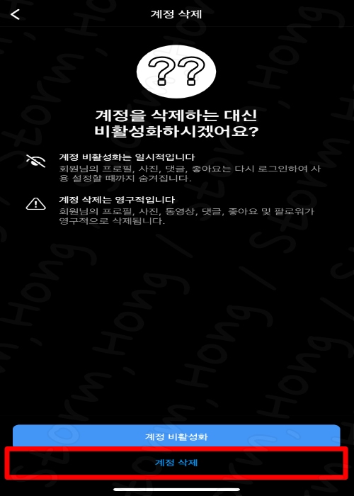 8. '계정 삭제' 를 누르면 삭제한 날로부터 30일 이전에 로그인하여 삭제 과정을 중단할 수 있다는 메시지가 나타납니다.