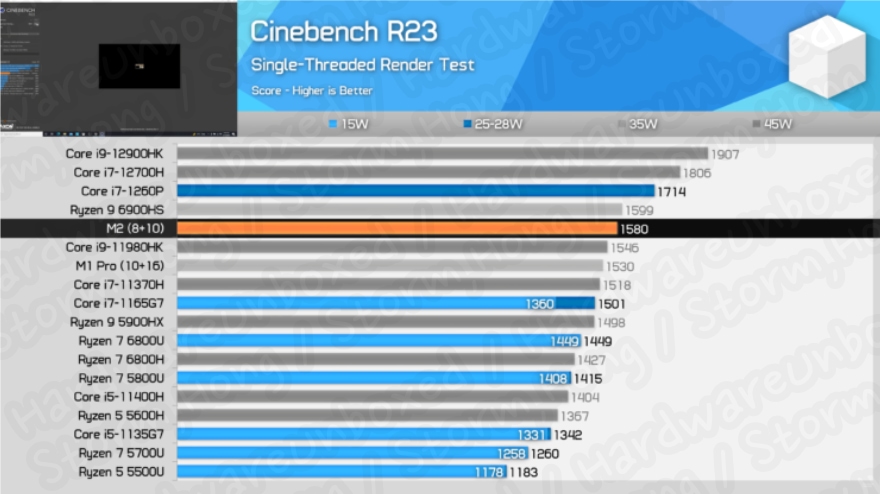 Apple M2 SOC 는 25 ~ 28 W TDP 동작 범위인 점을 감안했을 때, 대부분 유사한 TDP 에서 작동이 가능한 intel Alder Lake-U28 및 AMD Ryzen 6000U 부품과 경쟁한다고 알렸습니다. 이에 벤치마크 Test 에서 Apple M2 SOC 는 Cinebench R23 의 intel Core i7-1260P , AMD Ryzen 7 6800U 보다 느렸습니다. CB R23 단일 스레드 테스트에서는 Apple M2 SOC 는 AMD Ryzen 7 6800U에 앞서지만 Intel Alder Lake 칩보다는 점수가 낮았습니다.