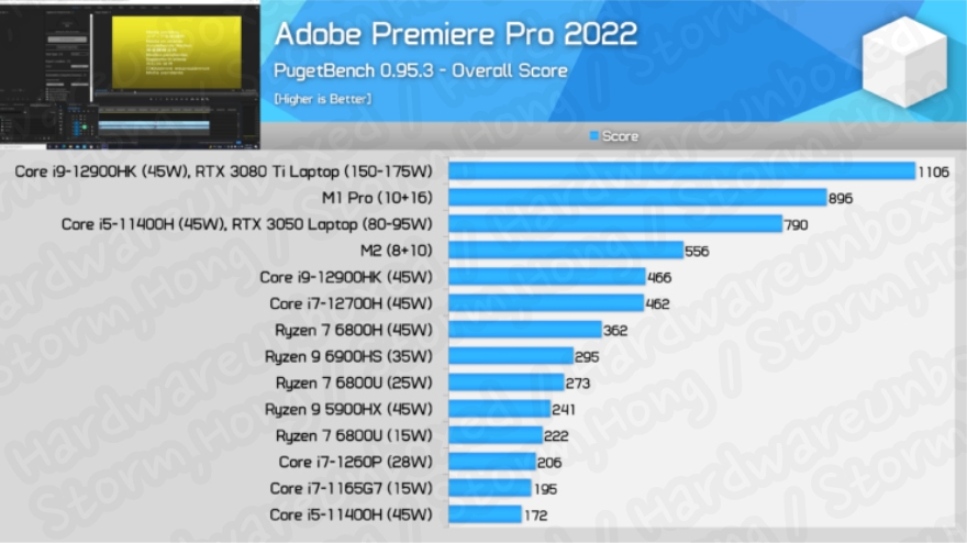 Apple M2 SOC 는 Adobe Premiere Pro 에서 성능이 크게 향상되었으며, 프로그램 내에서 Apple 전용 최적화로 인해 일부 고급 작업에서 45W 를 소모하는 칩 성능을 뛰어넘을 수 있습니다.