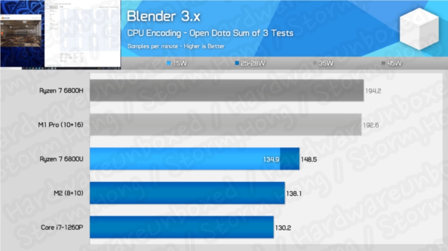 또한 새로운 정보는 HardwareUnboxed 를 통해 Apple M2 SOC 는 intel 11 세대, 12세대, AMD Ryzen 6000, AMD Ryzen 5000 라인업을 비롯한 다양한 AMD 및 intel Mobility CPU 와 비교한 정보가 나타났습니다.