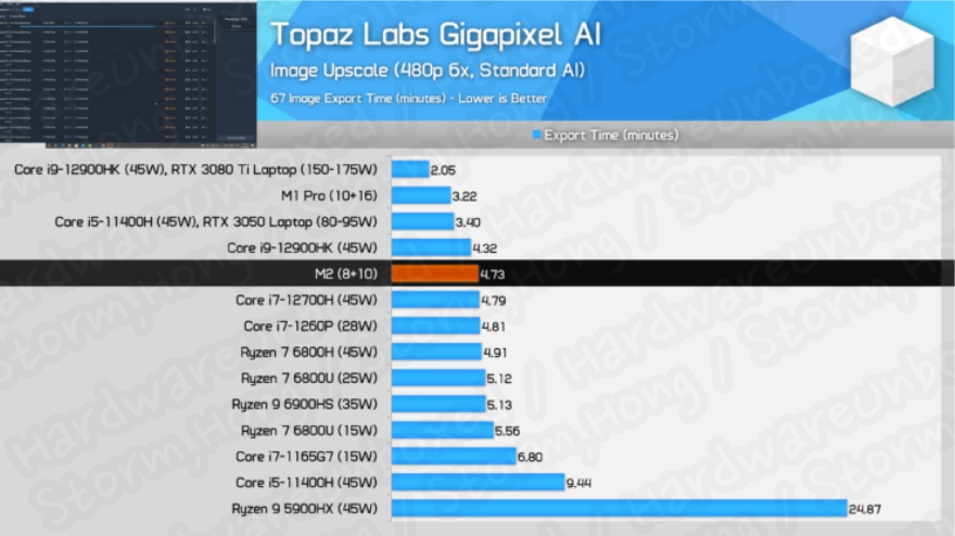 Apple M2 SOC 의 iGPU 가 인상적인 결과를 제공하는 Topaz Labs AI 와 같은 GPU 렌더링 앱을 통해 볼 수 있었습니다.