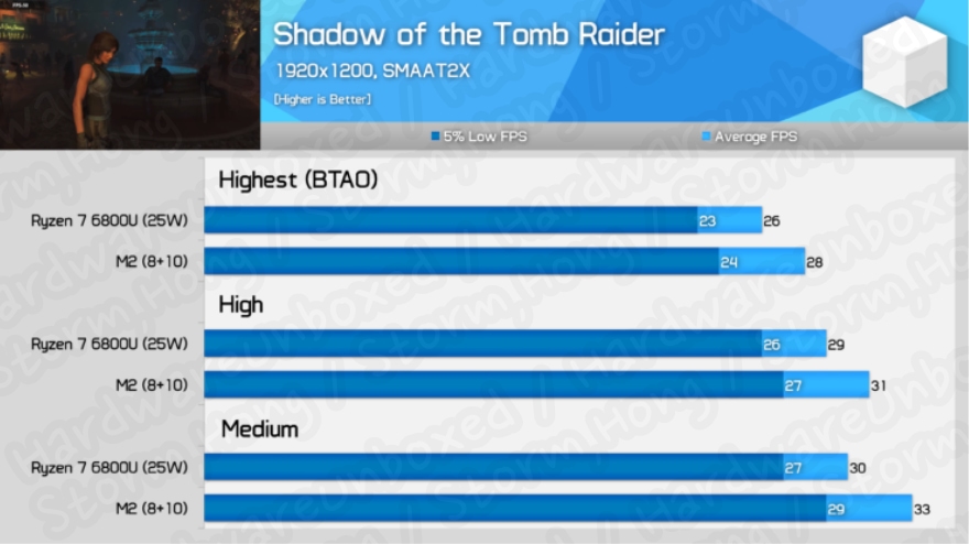 Apple M2 SOC 와 AMD Ryzen 7 6800U Shadow of Tomb Raider 비교 테스트 정보 등장?
