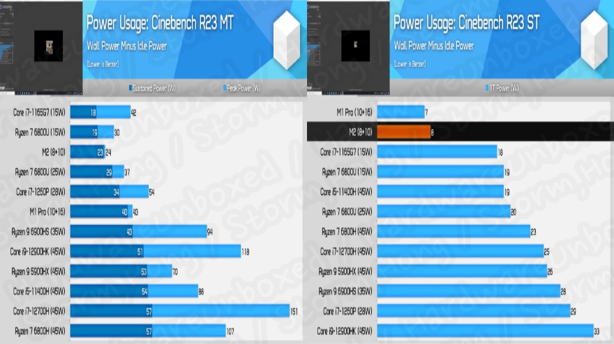 전력량에 따른 Apple M2 SOC 칩은 최대 24W 인 반면 AMD Ryzen 7 6800U 는 최대 37W, intel Core i7-1260P 는 최대 54W 로 전력 소모량이 많았습니다. 따라서 M2 Alder Lake CPU 의 두배 효율성을 제공한다는 Apple 의 주장이 이번 테스트를 통해 어느 정도 신빙성이 있음을 보여주었습니다.