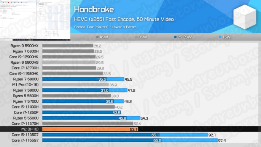 Handbrake는 Intel 과 AMD 가 Apple M2 SOC 보다 높은 점수를 유지했습니다.