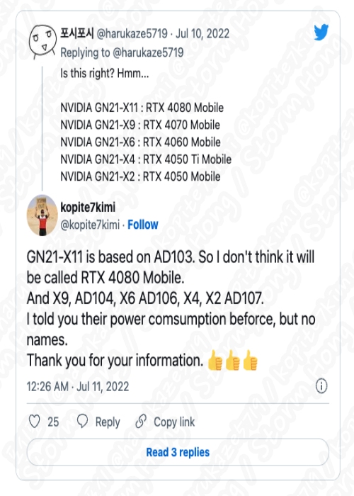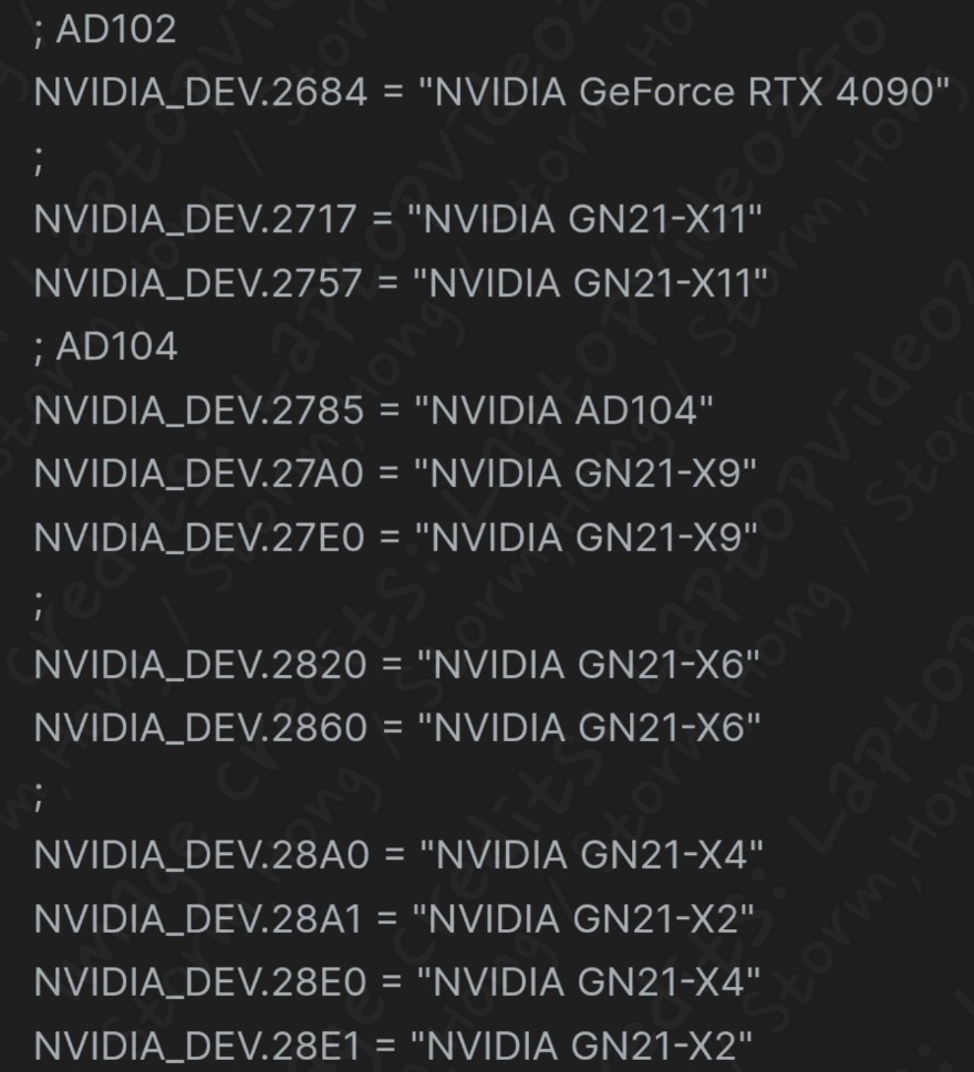 나머지 라인업은 AD103, AD104, AD106 및 AD107 칩과 같은 다양한 GPU SKU를 기반으로 하는 다양한 NVIDIA GeForce RTX 4000 시리즈 Mobility GPU가 혼합되어 있는 것으로 알려졌습니다. Kopite7kimi 에 따르면 GN21-X11 시리즈 SKU에는 AD103 GPU가 탑재될 것으로 보이며, AD104가 탑재된 GN21-X9, AD106 이 탑재된 GN21-X6, AD107 GPU 는 탑재된 GN21-X4/X2 가 사용될 것으로 보인다는 예상, 예측, 루머, 소문의 정보가 알려졌습니다. 또한 GN20 시리즈는 Ampere 제품군의 일부였으므로 GN21 라인업이 Ada Lovelace 제품군의 일부가 될 것이라고 보인다는 예상, 예측, 루머, 소문의 정보가 나타났습니다.