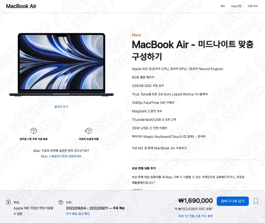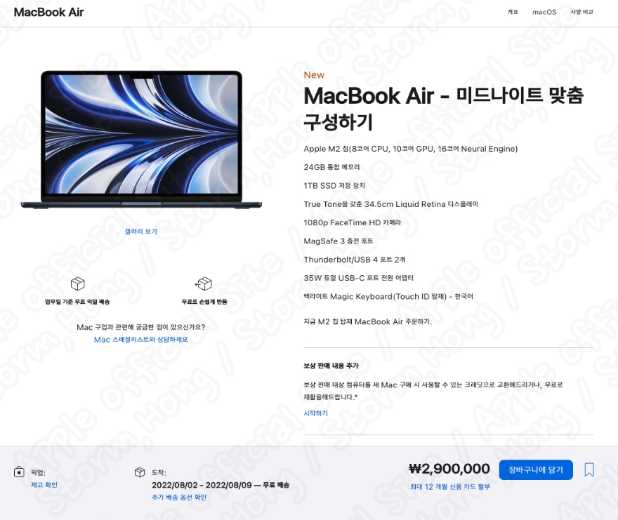 현재 2022년 7월 8일에 구매를 서둘러하신 분들은 M2 MacBook Air 기본 구성 상품은 7월 15일에서 7월 18일 에 받을 수 있도록 준비하고 있는 것으로 알려졌습니다. 그리고 다른 옵션을 선택한 CTO (Configure To Order) 제품은 2022년 7월 13일 구매를 할 경우 많은 시간이 소요되고 있으며, 옵션을 변경하는 CTO (Configure To Order) 의 경우 8월에 배송 날짜가 나타났습니다.