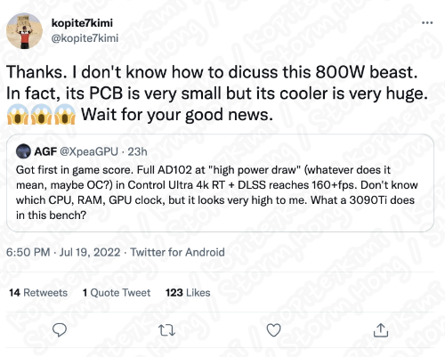 또한 Kopite7kimi 는 NVIDIA GeForce RTX 4090 그래픽 카드의 AIB 모델이 동일한 3DMark Time Spy Extreme 벤치마크 테스트에서 20,000 점의 점수를 보여준다는 예상, 예측, 루머, 소문의 정보가 나타났습니다. 이는 NVIDIA GeForce RTX 3090 Ti 보다 2배 더 높은 것으로 나타났으며, 플래그십 모델인 NVIDIA GeForce RTX 3090 Ti 그래픽 카드보다 70~80% 더 뛰어난 것으로 알려졌습니다.