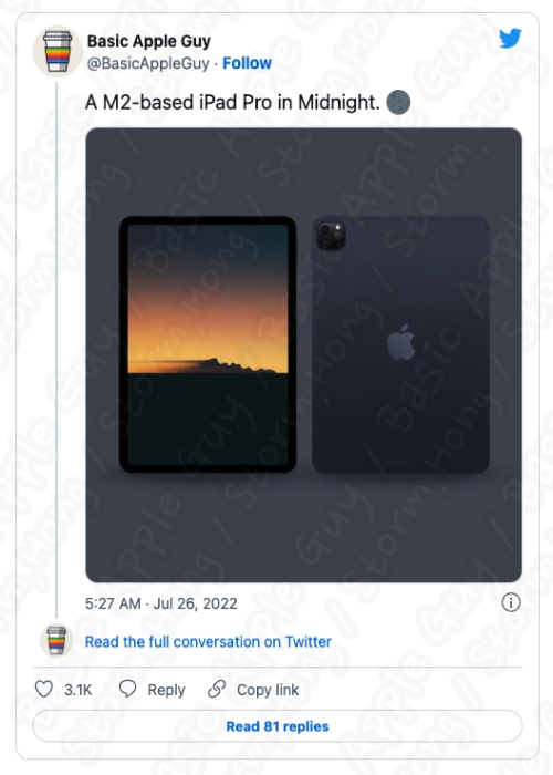 새롭게 등장한 정보에 의하면 M2 MacBook Air 의 출시에서 새로운 색상인 Midnight (미드나이트) 컬러가 주목을 받으면서 iPad Pro 에 M2 칩을 탑재한 미드나이트 M2 iPad Pro 가 출시할 것이라는 새로운 정보가 나타났습니다. 그 자세한 내용은 다음과 같습니다.