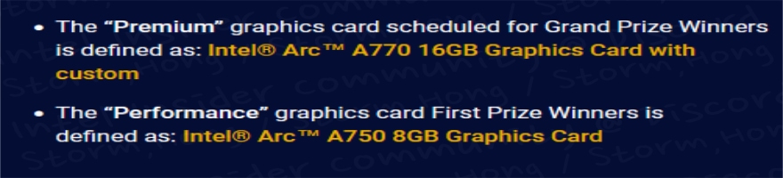 intel 은 또한 Xe-HPG Scavenger Hunt 수상자에게 상품으로 "Arc A770 16GB 그래픽 카드 - 프리미엄급 ' 를, 'Arc A750 8GB - 퍼포먼스급' 그래픽 카드를 준다고 알려졌습니다. 이는 그쪽에서 정한 날짜에 한하여 지급한다는 이야기였습니다.