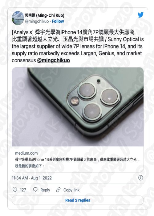 iPhone 14 및 iPhone 14 Max 의 경우 동일한 공급업체의 출하 점유율이 55-65% 가 될 것으로 보입니다. Sunny Optical 의 생산 능력이 증가함에 따라 Apple과 협상할 수 있게 되어 주문 수를 늘리고 결과적으로 시장 점유율을 높일 수 있을 것으로 보인다는 정보가 나타났습니다. 알려진 정보에 의하면 모든 iPhone 렌즈 중 광각 렌즈와 주요 렌즈에서 가장 높은 이윤을 제공할 것으로 보이며, 계속해서 생산량을 늘리는 것으로 보인다는 정보가 나타남에 따라 Sunny Optical 의 최대 이익이 증가될 것으로 보인다는 정보가 나타났습니다.