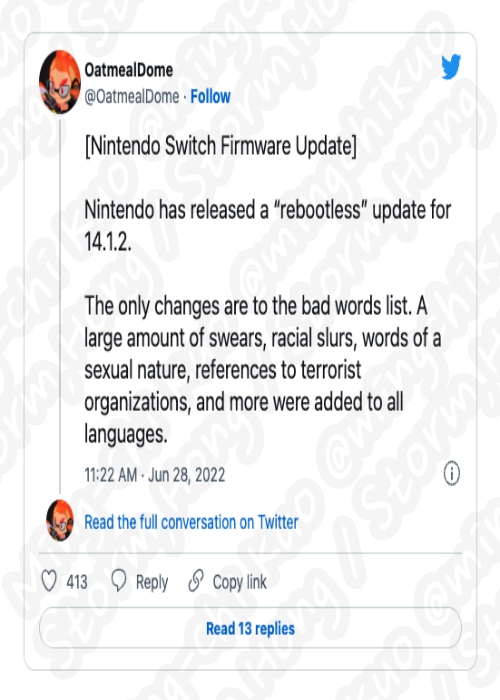 OatmealDome 에 따르면 이 새로운 업데이트는 리부팅 없이 자동으로 설치되는 업데이트로 알려졌으며, 스위치 펌웨어의 버전 번호를 변경하는 업데이트가 아니라고 알려졌습니다. 스위치에 대한 마지막 재부팅 없는 펌웨어 업데이트는 2020년 12월에 다시 릴리스 되었으며, 이 업데이트는 나쁜 단어에 대한 목록 업데이트의 최신화가 되었다는 이야기도 덧붙였습니다.
