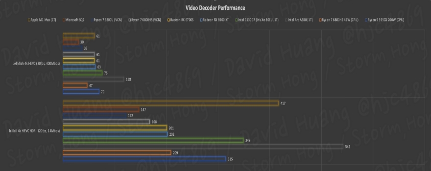 ↑ Video Decoder Performance of several systems and their performance on both the Jellyfish and bilibili video tests. Source: David Huang (@hjc4869 on Twitter)