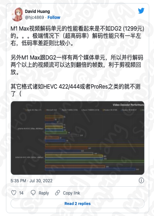 또한 Apple M1 Max 는 intel DG2 (intel Arc A380) 와 같은 2개의 미디어 유닛이 있어 2개 이상의 비디오 스트림을 병렬 디코딩하면 프레임 수가 2배가 될 수 있으며, 이는 비디오 클리핑 및 재생에 편리하도록 되어 있습니다.
