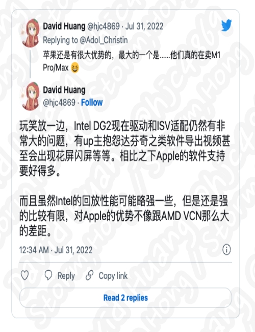 이에 대한 농담은 제쳐두고, intel DG2 는 여전히 드라이버 및 iSV 적용에 매우 큰 문제가 나타나고 있습니다. 이에 일부 상위 마스터는 DaVinci 및 기타 소프트웨어가 비디오를 내보내고 심지어 스플래시 화면 등을 가지고 있어 불편하고 많은 이가 불평하고 있습니다. 이와 반대로 Apple 의 소프트웨어 지원은 그에 비해 훨씬 좋은 모습을 보여주고 있습니다.
