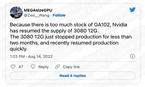 이에 NVIDIA가 요구하는 소비자보다 더 많은 카드가 있는 지점까지 NVIDIA GeForce RTX 3000 시리즈로 증가하는 인벤토리 문제를 공격적으로 해결해야 한다고 예상, 예측, 루머, 소문의 정보도 나오고 있었습니다. 이에 대한 정보는 MEGAsizeGPU 트윗을 통해 NVIDIA가 창고에 있는 GA102 GPU 재고를 많이 보유하고 있기 때문에 NVIDIA GeForce RTX 3080 12 GB 제조를 다시 한번 재조 할 수 있다는 예상, 예측, 루머, 소문의 정보를 이야기했습니다.