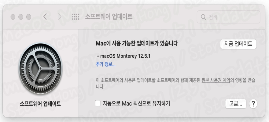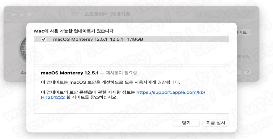 * macOS Monterey 12.5.1 업데이트 설치 공간은 1.18 GB 입니다. (설치용량은 이전 버전의 업데이트를 하지 않으신 분은 더 큰 용량일 수 있습니다.)