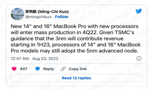 분석가 Ming-Chi Kuo 에 따르면 아래 트윗에서 새로운 MacBook Pro 모델의 대량 생산이 올해 말에 시작되지만 다음 모델에 연료를 공급하는 칩은 TSMC의 5nm 공정을 유지할 수 있다는 예상, 예측, 루머, 소문의 정복가 나타났습니다 Ming-Chi Kuo 에 의하면 TSMC의 3nm 칩 생산으로 인한 수익이 2023년까지 시작되지 않기 때문에 새로운 M2 Pro 및 M2 Max가 이전 세대 노드에서 만들어질 수 있다는 예상, 예측, 루머, 소문의 정보를 전했습니다.