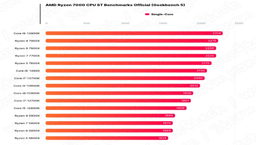 이는 게임 및 컨텐츠 작업에서 최적화된 intel Core i9-12900K 에 대한 AMD Ryzen 9 7950X 의 성능은 CPU 벤치마크에서 -1% ~ +23%% 더 빠르고 작업 부하 로드 비교 시 +36% ~ 62% 더 빠르다고 설명했습니다.