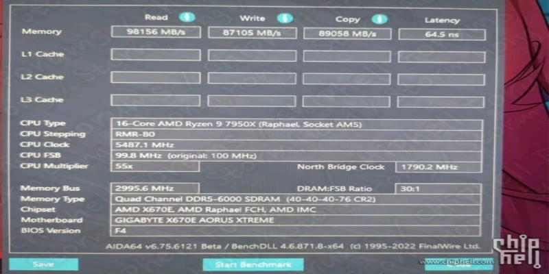 이중 AMD Ryzen 9 7950X 는 DDR5-6000 CL30 메모리를 실행할 것으로 알려졌으며 AIDA64 캐시 및 벤치 마크에 대한 정보가 나타났습니다. CPU 는 최대 98,156 MB/s (읽기) 의 메모리 대역폭을 생성하면서 64.5ns 의 대기시간을 보여준다는 예상, 예측, 루머, 소문의 정보가 나타났습니다.