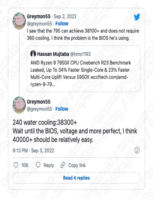 동일한 전력 제한 주변에서 Intel Core i9-13900K(250W 제한 전력 설정)는 Ryzen 9 7950X보다 약간 낮은 35-37K 포인트를 제공해야 하지만 Intel의 상황을 악화시키기 위해 최종 소매 칩이 Greymon55에서 보고한 대로 40,000점 이상을 보여주었다고 정보가 나타났습니다.