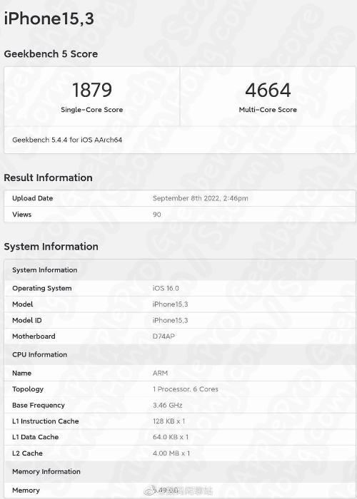 ShrimpApplePro 에 의해 공개된 Geekbench 5 이미지는 하단에 작게 워터마크가 표시되어 있으며, 중국에서 마이크로 블로깅 웹사이트인 Weibo 를 통해서 정보를 공개했다는 정보가 나타났습니다. 또 다른 세부 사항들도 나타났으며, 테스트한 제품은 iPhone 14 Pro 였으며 알려진 Ram 은 6GB 를 탑재한 것으로 예상, 예측, 루머, 소문의 정보가 알려졌습니다. 하지만 Apple 에서는 공식적으로 iPhone 14 Pro 모델에 대한 램에 대해서 정보를 알리지 않았습니다.