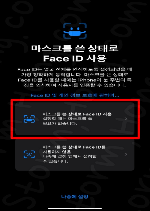 4. 마스크를 쓴 상태로 Face ID 사용 화면에서 마스크를 쓴 상태로 Face ID 사용 설정하는 화면이 나오면 클릭을 해줍니다.